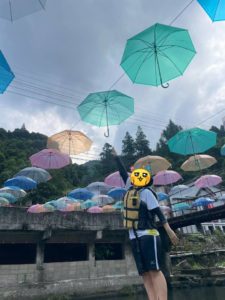 遊んだ川の近くにはパラソルの虹が・・・