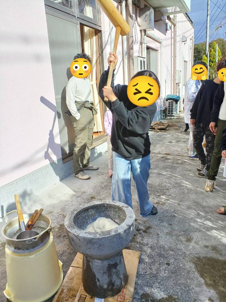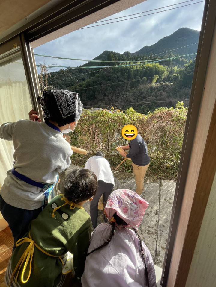 職員がもちをついていると食堂から「がんばれー」とかわいい声援が聞こえてきます。